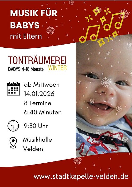 Bei der Stadtkapelle Velden dürfen auch schon die Allerkleinsten miteinander musizieren. Im Baby- und Kleinkindalter kommen sie zusammen mit einer erwachsenen Begleitperson in die Musikhalle und die Kinder machen die ersten positiven Erfahrungen mit Musik.